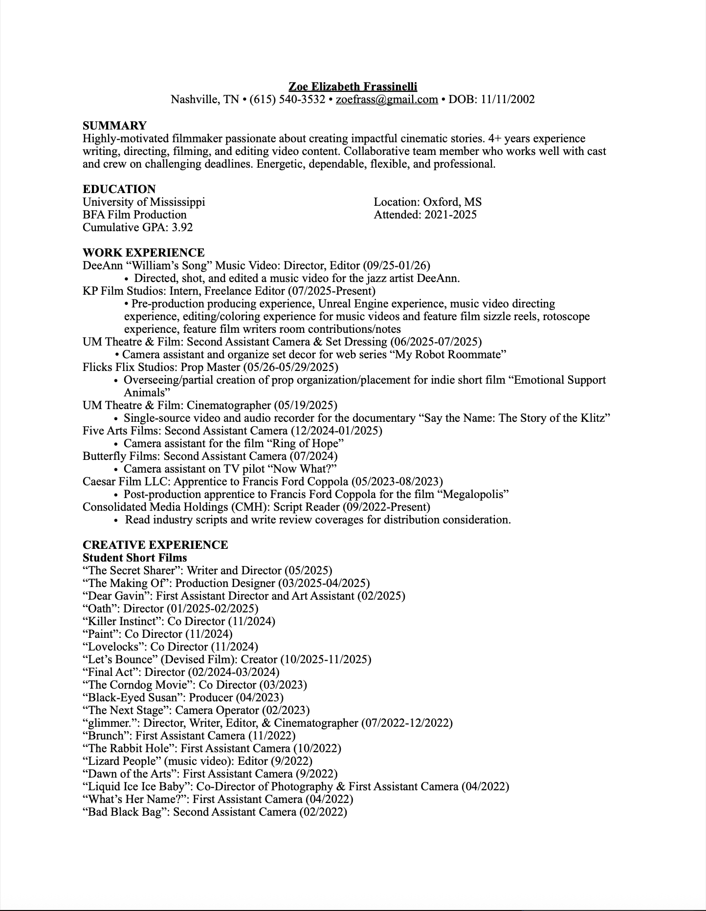 Resume Download full resume HERE Latest project:Freelance editor for KP Films StudiosCharlotte, NC Select Works Short Films Film Photography Reel